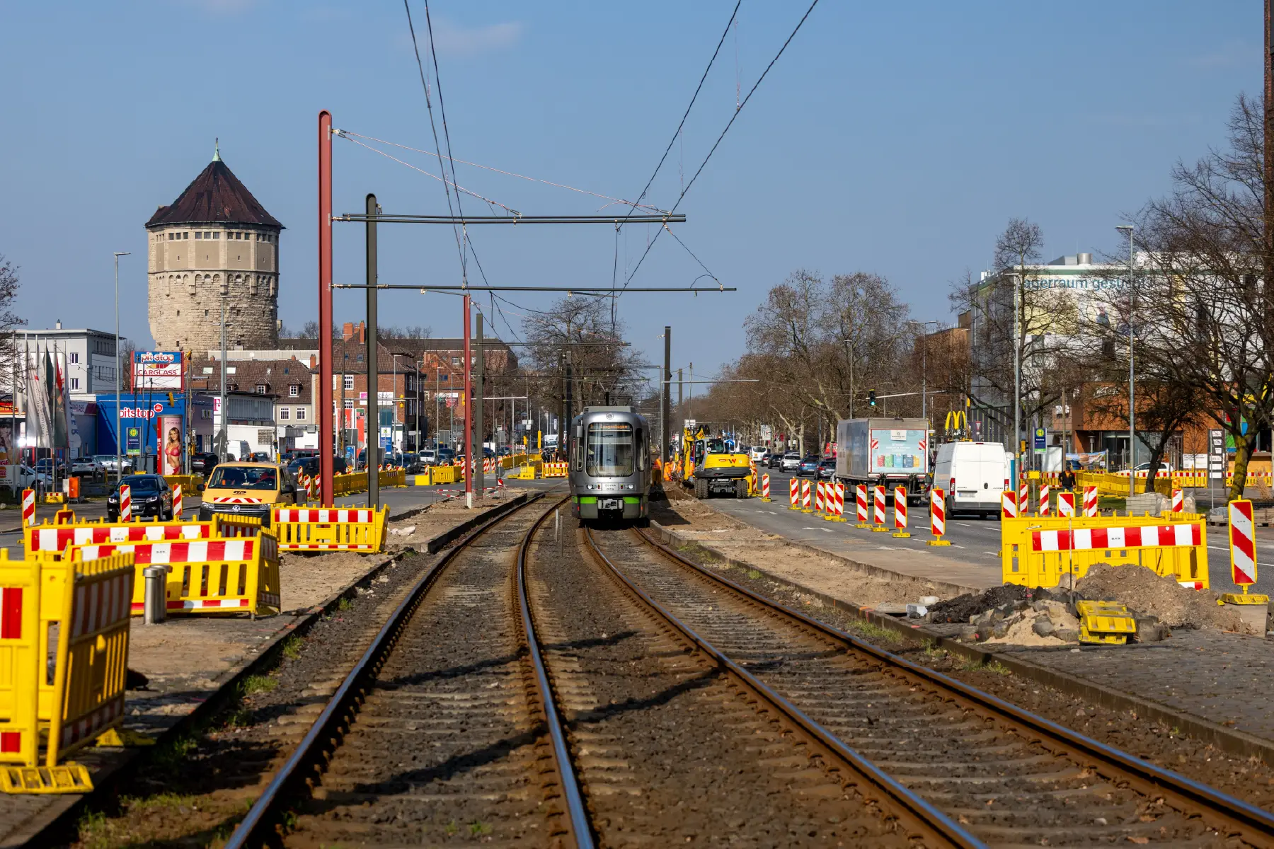 Für den barrierefreien Ausbau der beiden Stadtbahnhaltestellen sind zunächst Leitungen neu verlegt worden, die sich im Gleis- und Haltestellenbereich befanden. Außerdem wurden Gleise verlegt, neue Fahrleitungsmasten aufgestellt und Fahrdrähte aufgehängt. Die alten Haltestellen wurden zurückgebaut.